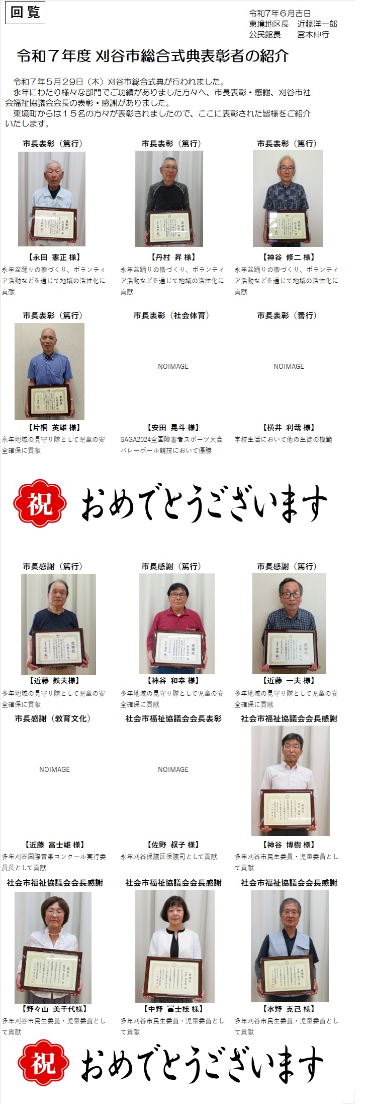 令和7年5月29(木)に開かれた、市政施行75周年記念式典において、東境町で15名の方が表彰されました。